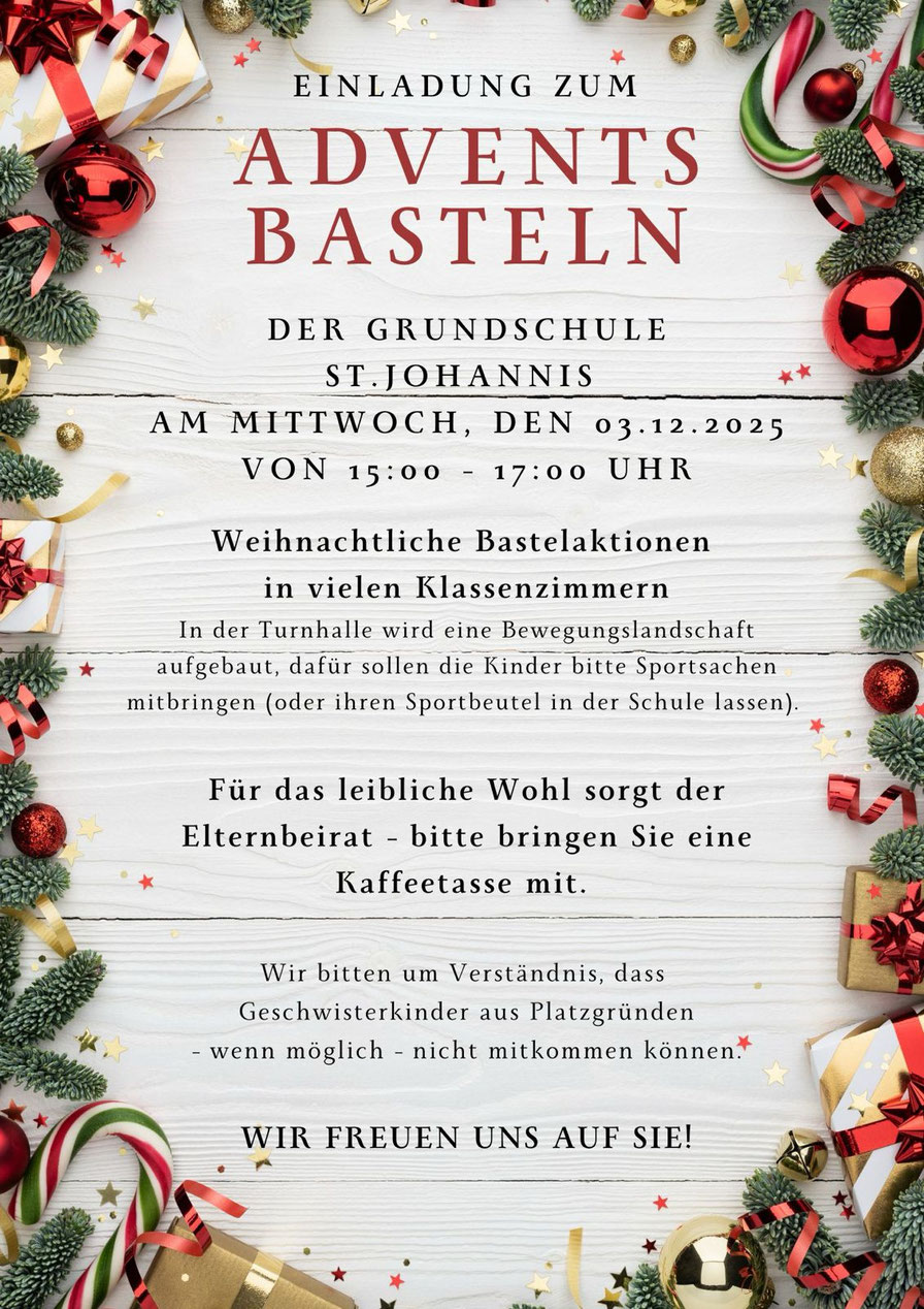| Mittwoch, 03. Dezember 2025 | Adventsbasteln 15 - 17 Uhr |