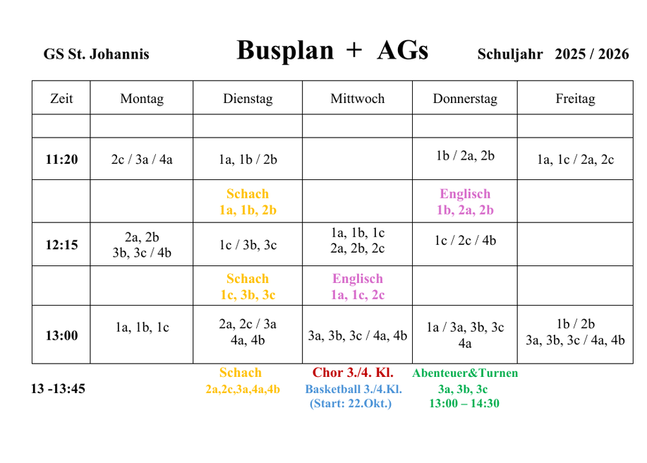 11:20 Uhr Schulschluss 1. Klassen 12:15 Uhr Schulschluss 2.-4. Klassen - evtl. gestaffelte Abfahrt |